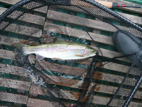 Nun denn, durch das gute Wetter ließ sich auch meine Frau aufs Boot locken, und auch bei ihr bissen nun die Salmoniden. Mehrere wunderschöne Regenbogenforellen waren wie einige wilde Drills der Lohn für die nachmittägliche Rückkehr an den See.