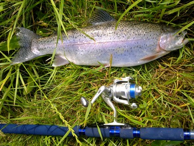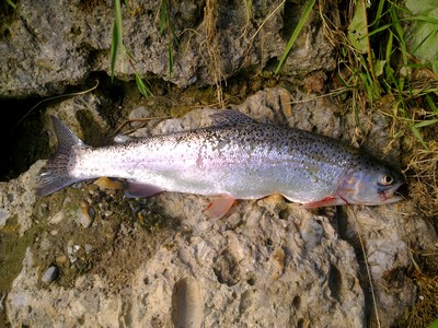 Nun beköderte ich meine Angel mit Bienenmaden und ließ sie über die so angefeuerte Stelle treiben. Gleich beim ersten Wurf spürte ich einen Biß den ich aber nicht parieren konnte. Also das ganze nochmal. Als die Pose wieder über diese Stelle trieb gabs einen Biß den man nicht übersehenkonnte. Die Forelle nahm mir sofort einige Meter Schnur von der Rolle und mit Hilfe der Strömung war sie auch gleich mal 20 Meter weg von mir. Aber ich pumpte sie immer weiter zu mir her und schließlich gelang mir die glückliche Landung - Stoßgebet zu Petrus und abgmessene 45 cm und zu hause gewogene 1,30 Kg Regenbogenforelle. Da dies zum Glück noch nicht reichte fing ich dann gleich 10 Minuten später noch eine mit 37 cm.