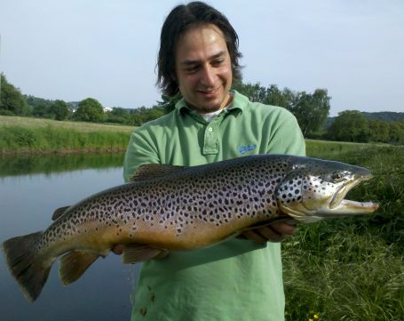 Nach fünf endlos scheinenden Minuten bekam er seinen Gegner, eine riesige Bachforelle, das erste Mal zu Gesicht. Nach weiteren zehn Minuten nervenaufreibendem Drills konnte er den Fisch vorsichtig über den eigentlich viel zu kleinen Kescher führen. Ein paar Tage später konnte Christian Klapper an der gleichen Stelle noch zwei Döbel von 2,3 und 2,5 Kilo sowie zwei kleinere Bachforellen fangen, die sich wohl erst jetzt aus ihrer Deckung getraut hatten.