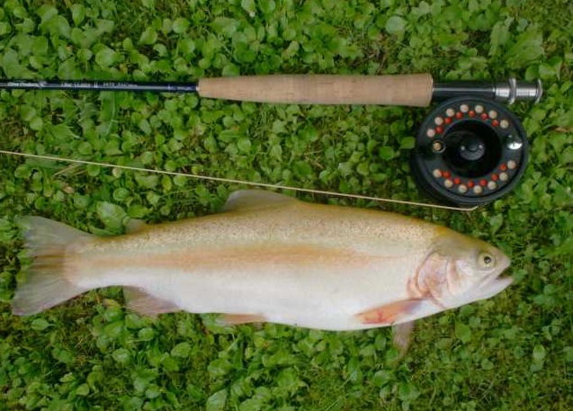 Ich hab da mal ein altes Foto von meiner einzigen Goldforelle gefunden. Ich hab sie vor ein paar Jahren in der Mur bei Leoben gefangen, da war ich auch noch zeitweise mit der Fliegenrute unterwegs